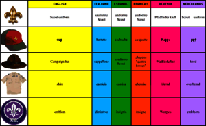 • Scout Pictionary (PDF) - Ein Wörterbuch illustriert mit Bildern in Deutsch, Englisch, Französisch, Italienisch, Niederländisch, und Spanisch